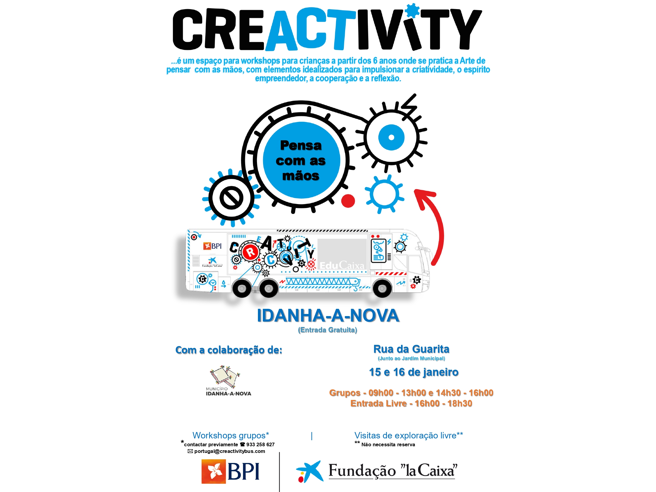 O espaço itinerante Creactivity, patrocinado pelo BPI e Fundação "La Caixa", estará de 15 a 16 de janeiro em Idanha-a-Nova, junto ao Jardim Municipal. É uma iniciativa aberta à comunidade, concebida para despertar a engenhosidade, a destreza e a criatividade das crianças e jovens (mas para a qual os familiares e professores também são convidados).