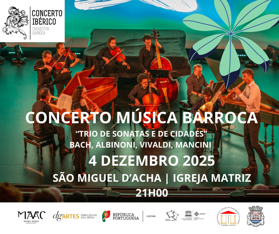 No próximo dia 4 de dezembro, na Igreja Matriz de São Miguel de Acha, pelas 21H, o Concerto ibérico Orquestra Barroca irá apresentar-se em concerto no âmbito da sua Residência Artística de Inverno intitulada “Trio de Sonatas e de Cidades” com música de Bach, Albinoni, Vivaldi e Mancini, entre outros.