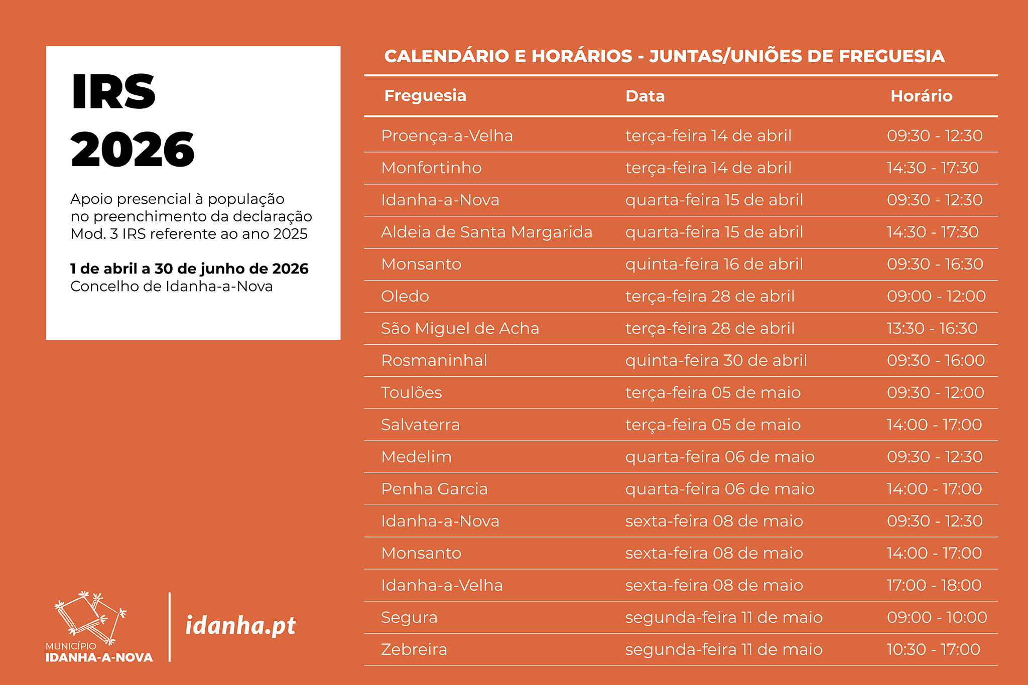 A Câmara Municipal de Idanha-a-Nova, em colaboração com as Juntas e Uniões de Freguesia do concelho, disponibiliza apoio gratuito à população no preenchimento e entrega da declaração de IRS.